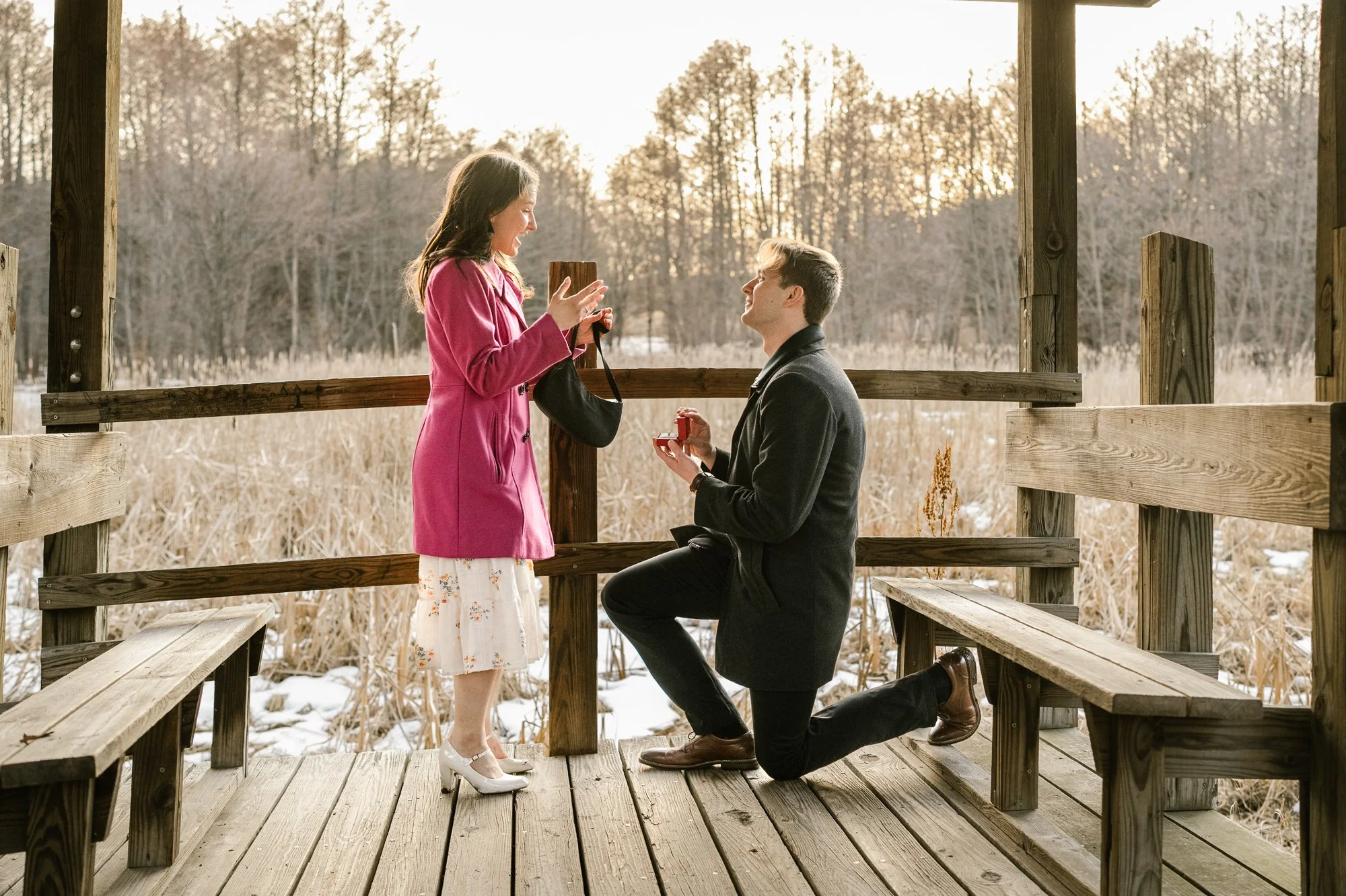 When planning a winter proposal, consider your partner’s preferences—whether they love the magic of the outdoors or prefer the warmth of an indoor setting. While it might seem too cold for an outdoor proposal, as a professional proposal photographer with lots of experience, I can tell you that most of the proposals I’ve photographed have happened outdoors—even in the winter! Plus, if you’re hiring a photographer, the lighting and scenery are almost always more beautiful outside. That said, it doesn’t have to be outdoors if that’s not your partner’s style. Choosing a location that reflects their personality ensures the moment feels authentic, thoughtful, and perfectly them.